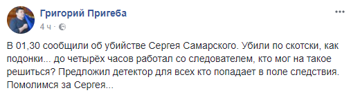 11:50 Заместитель мэра Северодонецка Луганской области Григорий Пригеба сообщил, что убийцы не тронули вещи Самарского и его барсетку с деньгами. По словам Пригебы, это говорит о заказном характере преступления.